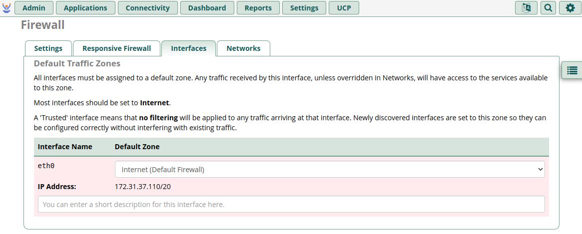 On this tab, you need to properly configure the Zones for any network interfaces. By default, you'll only have one Interface, which is the main virtual Ethernet adapter of your Instance. It will be identified as “eth0” but you may also have additional interfaces for things like the OpenVPN support (tun0) if you have enabled it.