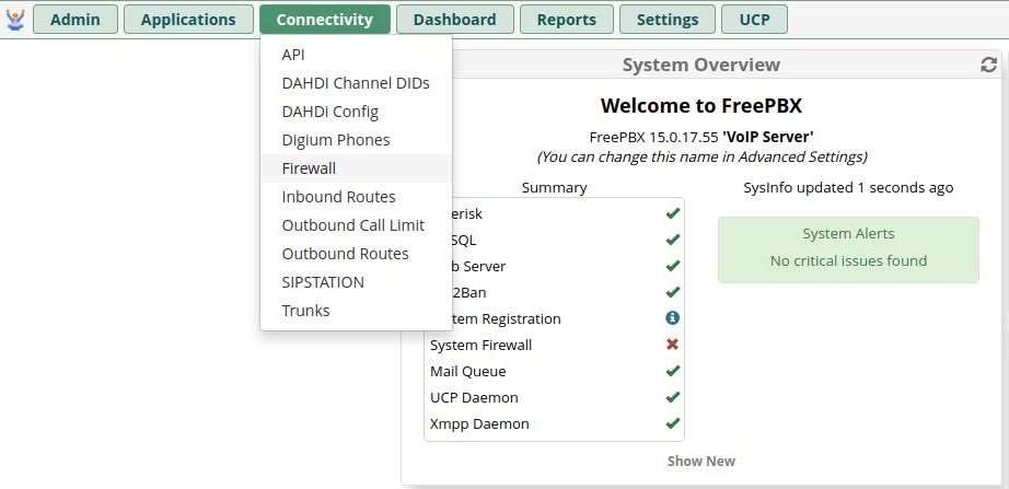 Head to ''Connectivity > Firewall'' on the AWS FreePBX GUI