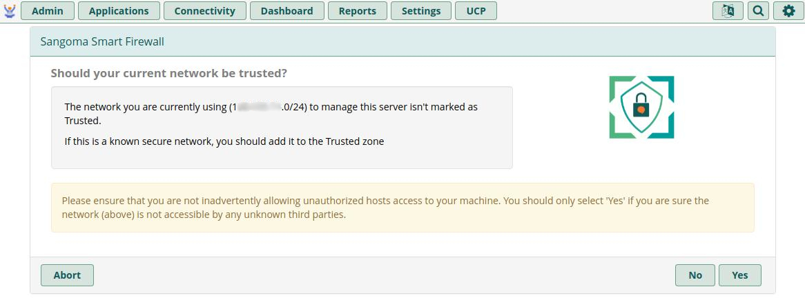 You will be asked if you want to add your current local network's Internet subnet to the Trusted list. If you are currently using your Company's main internet to run this wizard, this will save you a step later if you click Yes. If you do not want to add your current internet subnet to the trusted list, you can click No