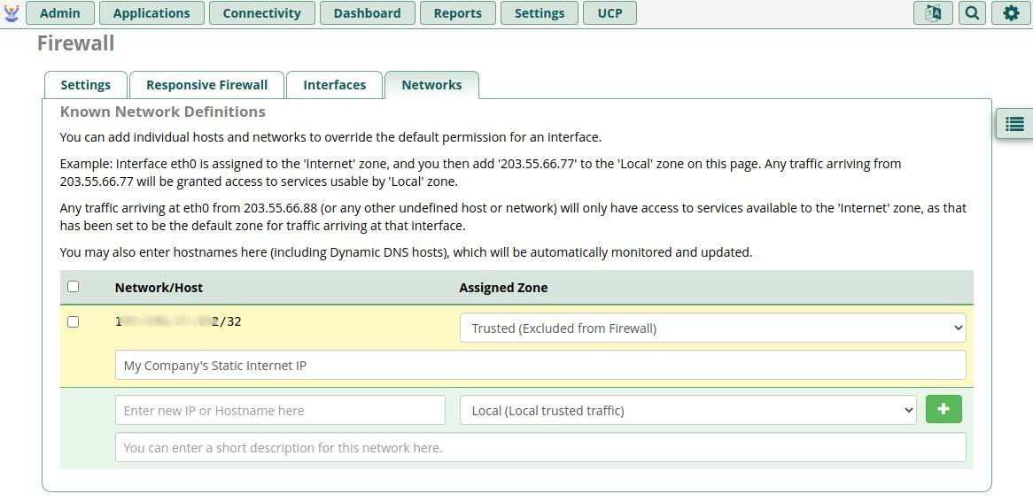 Here you will specify your known networks and set how each will be treated by the Firewall. The + adds additional entry slots to the list.
