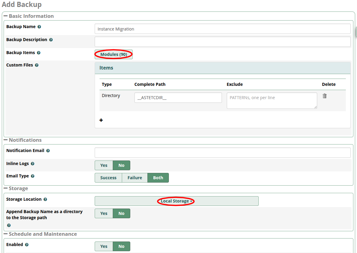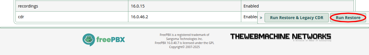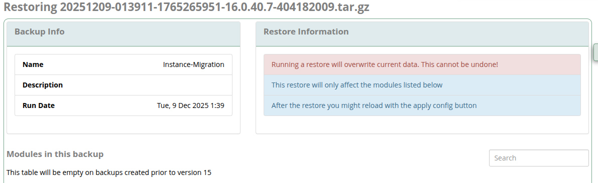 For the fastest possible migration experience, if you do NOT need your CDR/CEL (calls) history and Recordings migrated over, you may DEselect the “CDR Reports,” “Call Event Logging,” and “Recordings” modules in the Modules list. This will greatly reduce the backup file size AND greatly reduce the Restore process time on the new instance. We have seen CDR/CEL restorations from older/larger instances take HOURS to complete. You always have the option to export a backup of just the CDR/CEL and Call Recordings from the old instance to later import into a SQL and/or File server of your choice if you need archival retention of that call data.