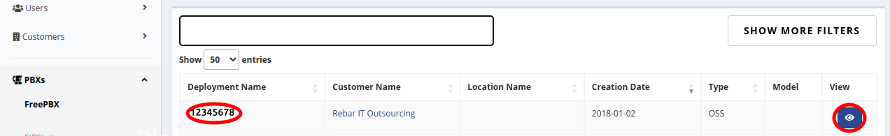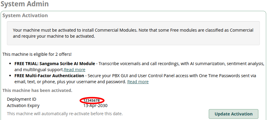 Deployment IDin thePBXs > FreePBXsection and click the blue view/eyeball button on the right. Your Deployment ID can be found on original instance underAdmin > System Admin > Activation