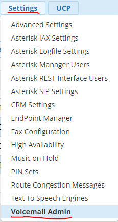 Choose Voicemail Admin from the Settings menu in the FreePBX GUI: