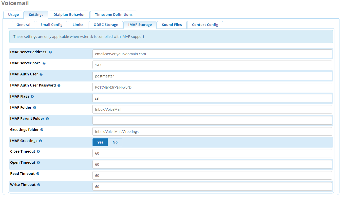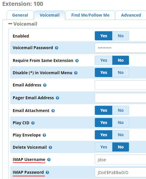 - If you are NOT using a master “postmaster” account, you must enter BOTH the IMAP Username AND IMAP Password of the user who will be storing the Voicemails for this extension