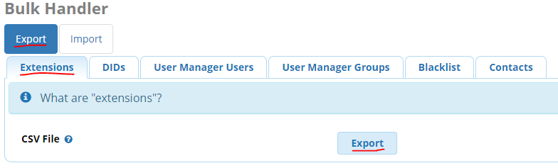 - You will start out on this page in Export mode on the Extensions tab. This is where we want to begin. Click the Export button next to CSV File. This will download a .csv file containing all of your extensions and their related settings. You can open this in Microsoft Excel or any other spreadsheet application for an easy to read/edit form. YOU MUST SAVE ANY RESULTING CHANGES AS A CSV FILE AT THE END TO IMPORT; OTHER FILE FORMATS ARE NOT SUPPORTED FOR IMPORT!