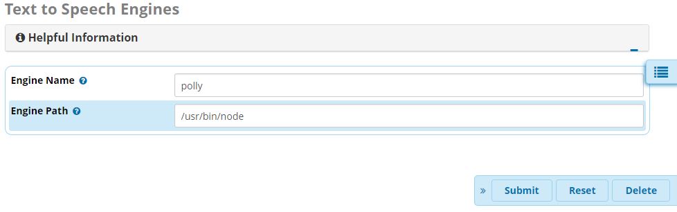Once the script is finished, you’ll want to add the polly engine via Settings > Text to Speech Engines and specify /usr/bin/node as the Engine Path: